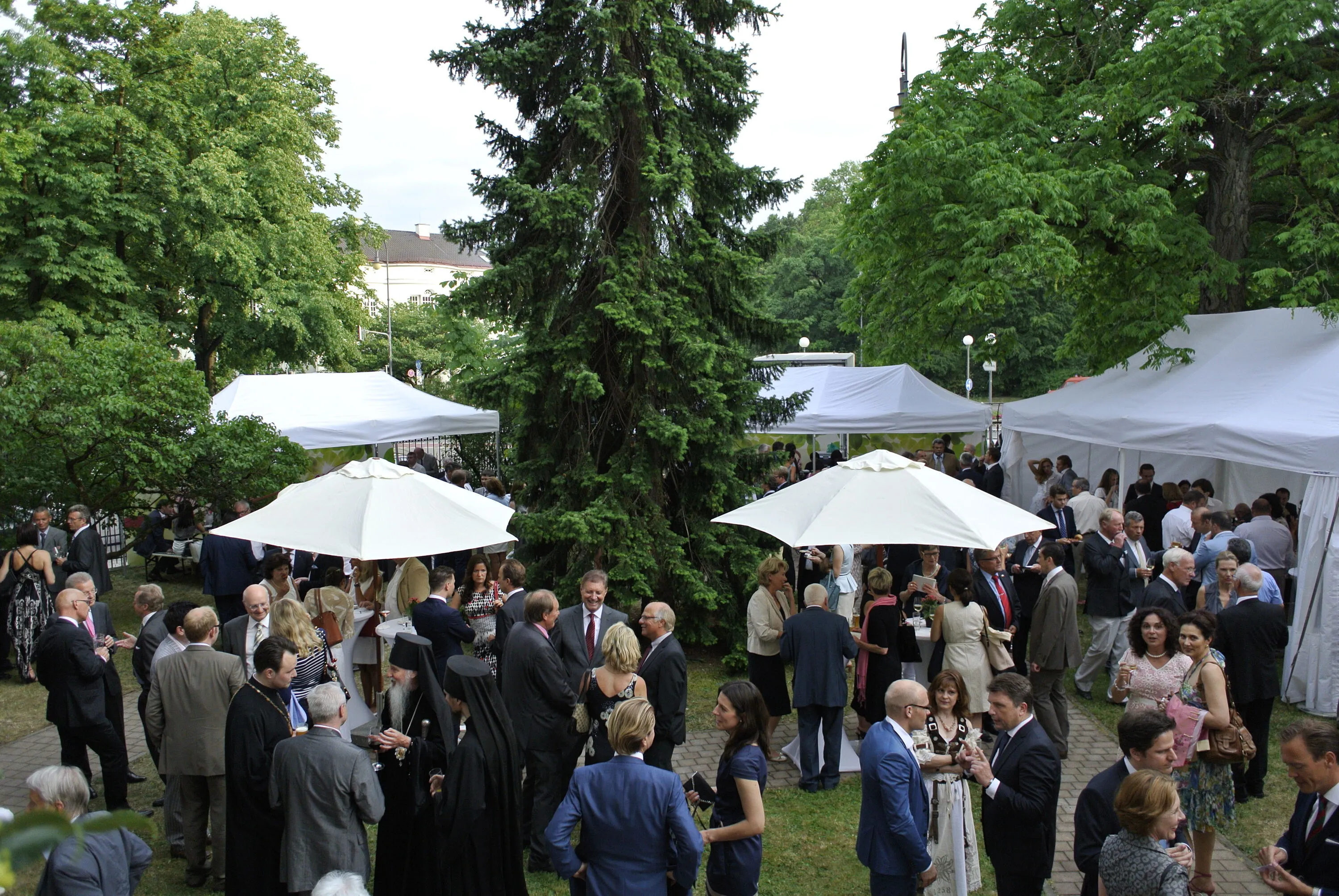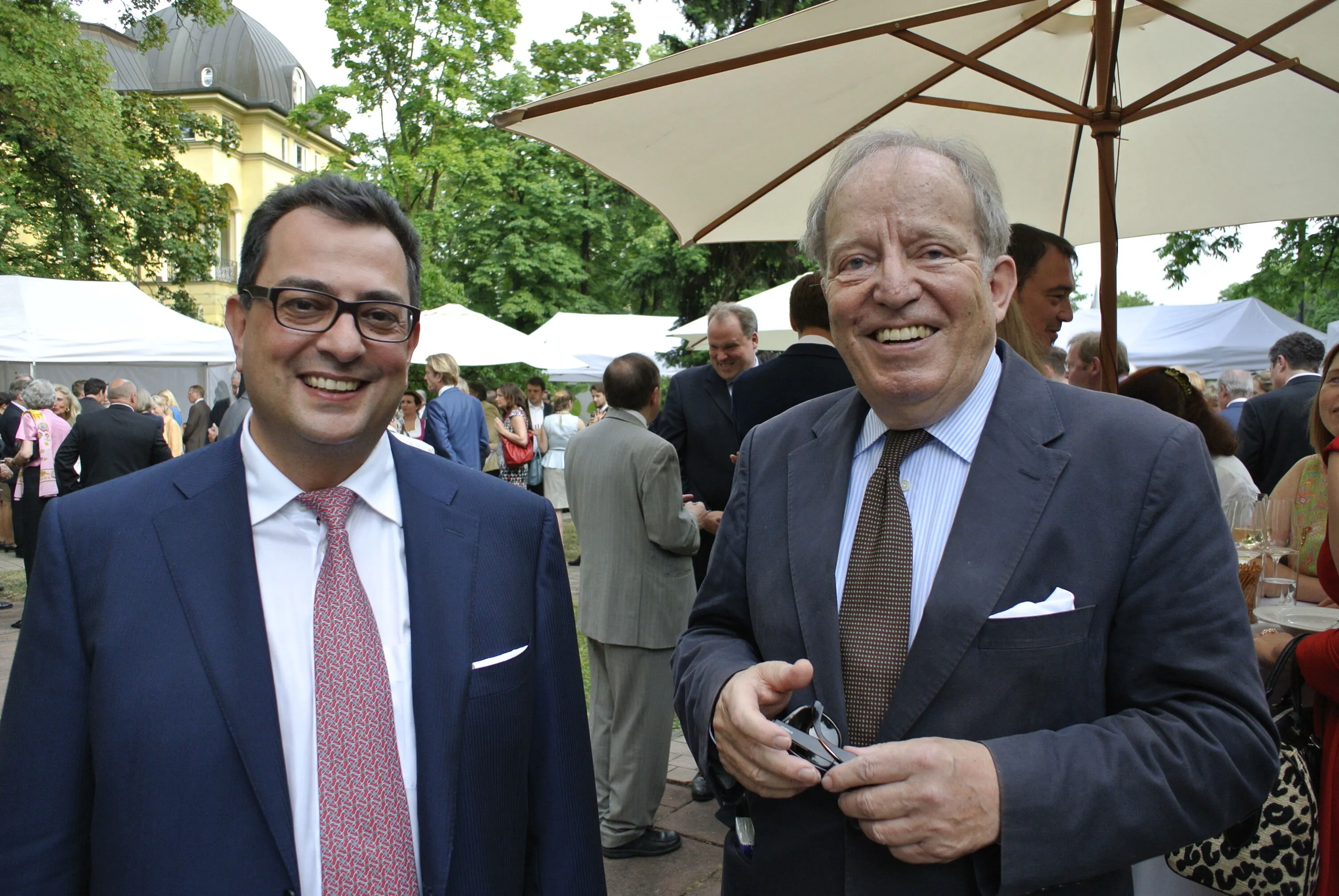 Das Wetter ist kaiserlich, in den letzten Jahren hatte Andrey nicht soviel Glück. Es ist immer ein besonderer Termin, bei dem sich Prinz Luitpold von Bayern sehen läßt. Gleich nach der Treppe zum Park treffe ich Stavros Kostantinidis, einer geschicktesten Kontakter Münchens, verheiratet mit Saskia Greipl, Tochter des verstorbenen Beisheim-Stiftungs-Verwalter, Ex-Protokoll-Chef Axel Bartelt (picobello im Blaser), Andreas Steinfatt (wie aus dem Ei gepellt), FDP-Politikerin Gabriele Weißhäupl, Ernergie-Unternehmer Christian Auer, Konsul Paul Ruprecht Roever und Justiz-Minister Winfried Bausback, der bei seiner Ansprache diplomatische Worte zur internationalen Lage fand. Putin mache zumindest optisch seinen Job im Moment besser als Präsidenten-Kollege Obama. Russische Geistlichkeit trägt freundliche Gesichter zur Schau.