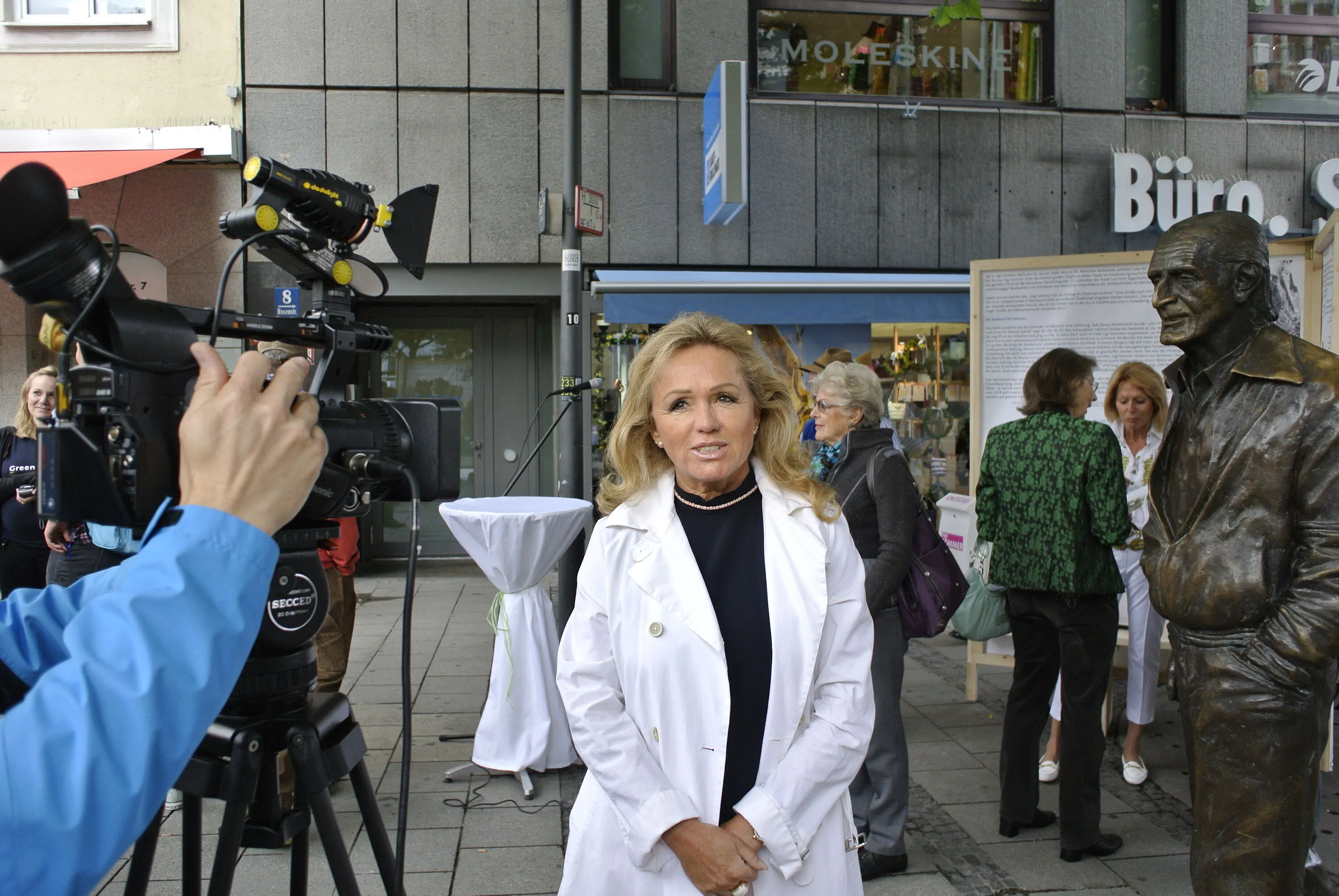 Das Schwarzweiß-Bild mit Blaisus beim Gehen in der Fußgänger-Zone ist eine Co-Produktion von meinem Fotografen Franz Hug und mir, weil ich nie gestellte Fotos in der Zeitung schätzte. Für ein Seiten-Bild braucht man Leben und so ließ ich Sommer laufen. Das Foto, später Vorlage für die Statue, wurde nicht - wie zur Zeit auf der Erklär-Tafel beim Denkmal behauptet - per Computer "nachbehandelt". Als das Foto in einer Mittagspause in den 70er Jahren live geschossen wurde, gab es noch keine Computer.