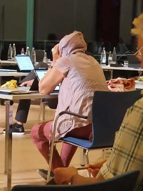 Jetzt kommt überraschend eine öffentliche Version dazu, weil es der Dorf-Diktatorin Tausendfreund plötzlich gegen den Strich geht So kommt es zu diesem ländlichen Doppelmoppel, ein zweiter Bildungsweg muss überflüssigerweise her. Die Vertreter der verschiedenen Parteien leiern ihre Argumente herunter. Die längst beschlossene Sache wird neu aufgerollt und erinnert an aktuelle Auslegungen deutscher Demokratie, wie zum Beispiel Angela Merkel aus Afrika in DDR-Manie eine Wahl in Thüringen in Frage stellt. Fast alle nicken und knicken vor Pullachs Bürgermeisterin Tausendfreund, die ein Lichtdouble von Merkel sein könnte, ehrwürdig brav, darunter einer mit Ku-Klux-Klan-Kaputze ( die Räumlichkeit ist nachweislich wasserdicht ) und diskutieren, als ob alles ganz unbekannt sei. Einer schlägt vor, ein Museum in den paar Quadratmetern zu machen. In direkter Nachbarschaft in Gehlens leerstehender Kontroll-Zentrale wäre dafür tausendmal mehr Platz .