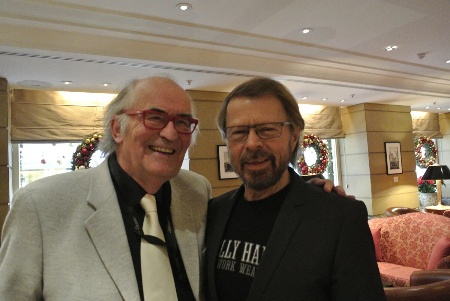 Björn, bei dem die Techniker noch vergessen hatten, das Funk-Mikrophon auszuschalten und seine „Gottseidank positive“ Unterhaltung mit SängerMichael Buble im Backstage-Bereich in den Saal übertragen wird, bleibt nicht lang auf dem ZDF-Sofa und läßt sich nach München chauffieren. Gestern vormittag treffe ich ihn im Hotel zusammen mit seinem ehemaligen Leibfotografen Bubi Heilemann, der zehn Jahre lang ABBA in allen Lebenslagen knipste und jetzt mit seinem Foto-Schatz mit der Multivisions-Show "ABBA Hautnah“ auf Tournee geht. Björn, der fließend deutsch spricht und die Sprache nicht erst vor drei Wochen gelernt hat, wie er in der ZDF-Sendung kokettierte, ist eben treu zu alten Weggefährten.