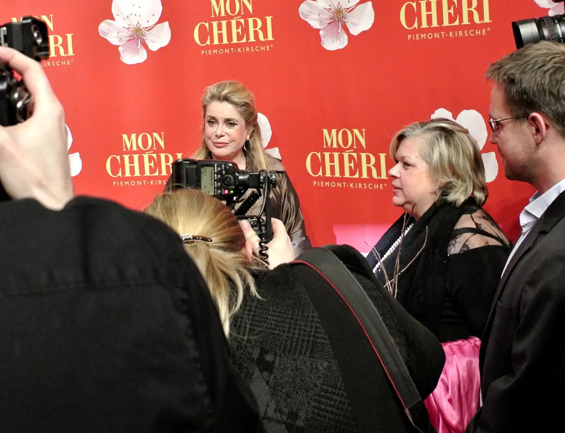 Der rote Teppich, dessen eigentliche Funktion es ist, die Hochkarätigkeit einer VIP-Soiree vor dem Eingang des Fest-Schauplatzes zu demonstrieren, wurde an diesem Abend direkt in den Party-Raum verlegt und die Medien-Meute hinter roter Kordel gebändigt. Vor der "Mon Cheri"-Werbe-Wand in Knallrot mit weissen Kirschblüten fand in gleissendem Licht ein gesellschaftliches Casting statt, wer wohl die schönste Robe hat, ein charmantes Hauen und Stechen.