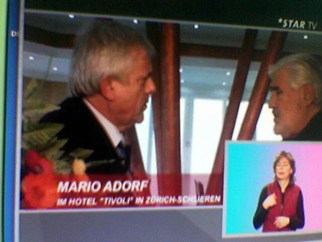 Weltstar Mario Adorf beim Live-Interview in Zürich mit Michael Graeter. Rechts die Sprachendollmetscherin des Fernsehens.