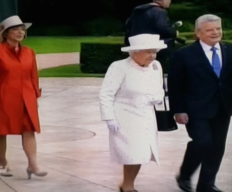 DIE QUEEN LÄCHELT UND DER BUNDESPRÄSIDENT GAU(C)KELT EINE EHEFRAU VOR