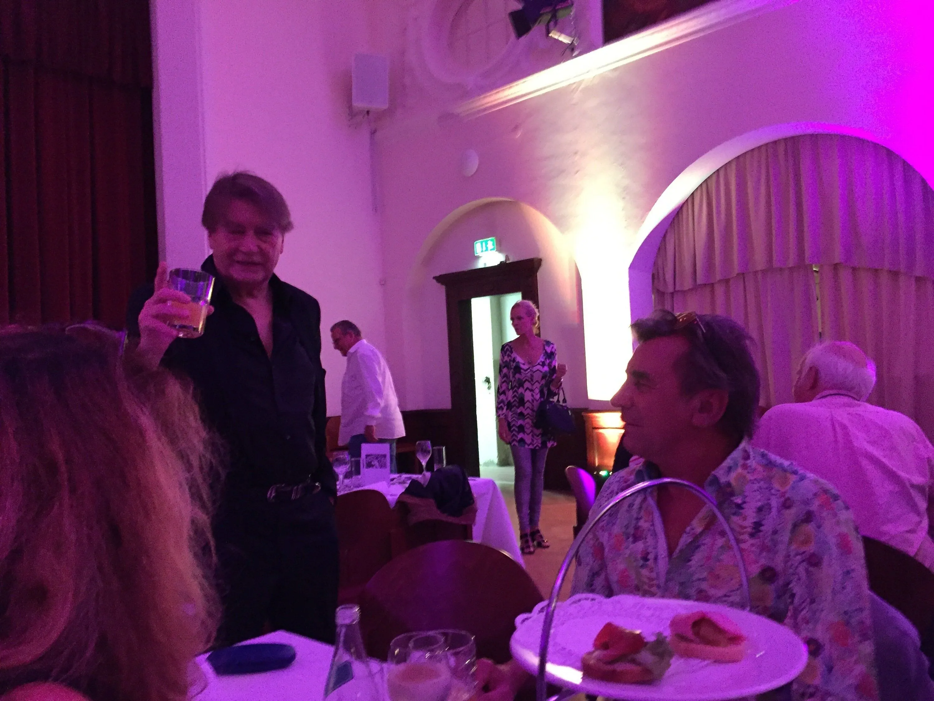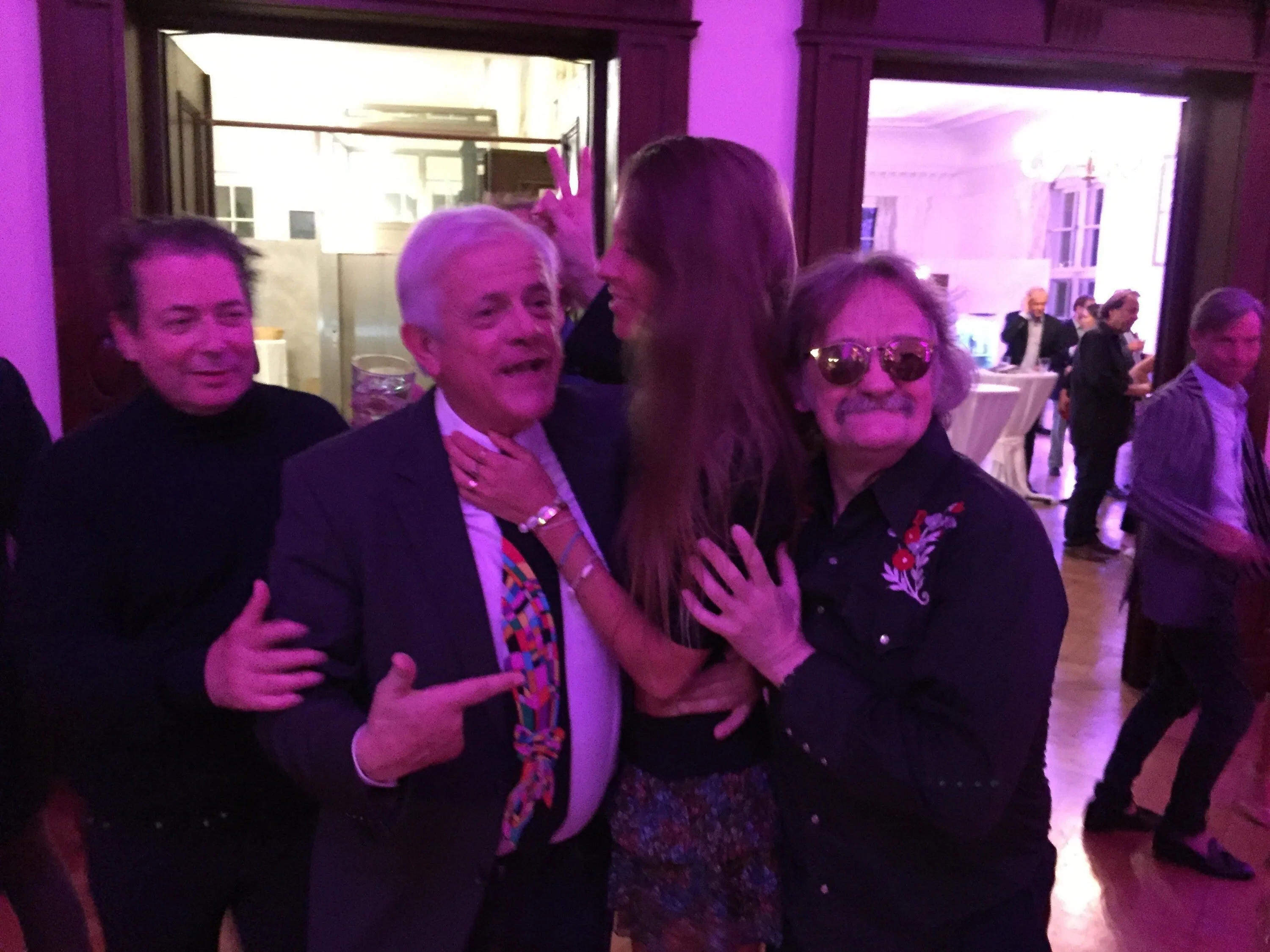 Mit Ausnahme vom Menue-Selfservice (Roger:“Damit sich die Leute besser kennenlernen“) erinnert mich das Fest in der Ledererstraße im Ballsaal "Max Planck" mit seinen acht Meter hohen Stuck-Decken an Rogers etwas weiter zurück liegende römische Phase, wo er zu Zeiten von Lucino Visconti, Helmut Berger und Alain Delon vor und hinter dem Set viel familiären Pfeffer verstreute. Eine leicht verwegene Lässigkeit hat diese Nacht. Maler und Discoman Theo jubelt „einfach groovy“. „Den Rhythmus, alle 10 Jahre ein Fest, werden wir unterbrechen – eine reine Zeitfrage“, steht in der Einladung, die auch von Rogers Lebensgefährtin Margit Friedrich unterschrieben ist. Für die gemeinsame zurückgelegte Marathonstrecke mit Roger ohne Ring und Trauschein durch dick und dünn verdient seine Göttin eine Tapferkeitsmedaille.