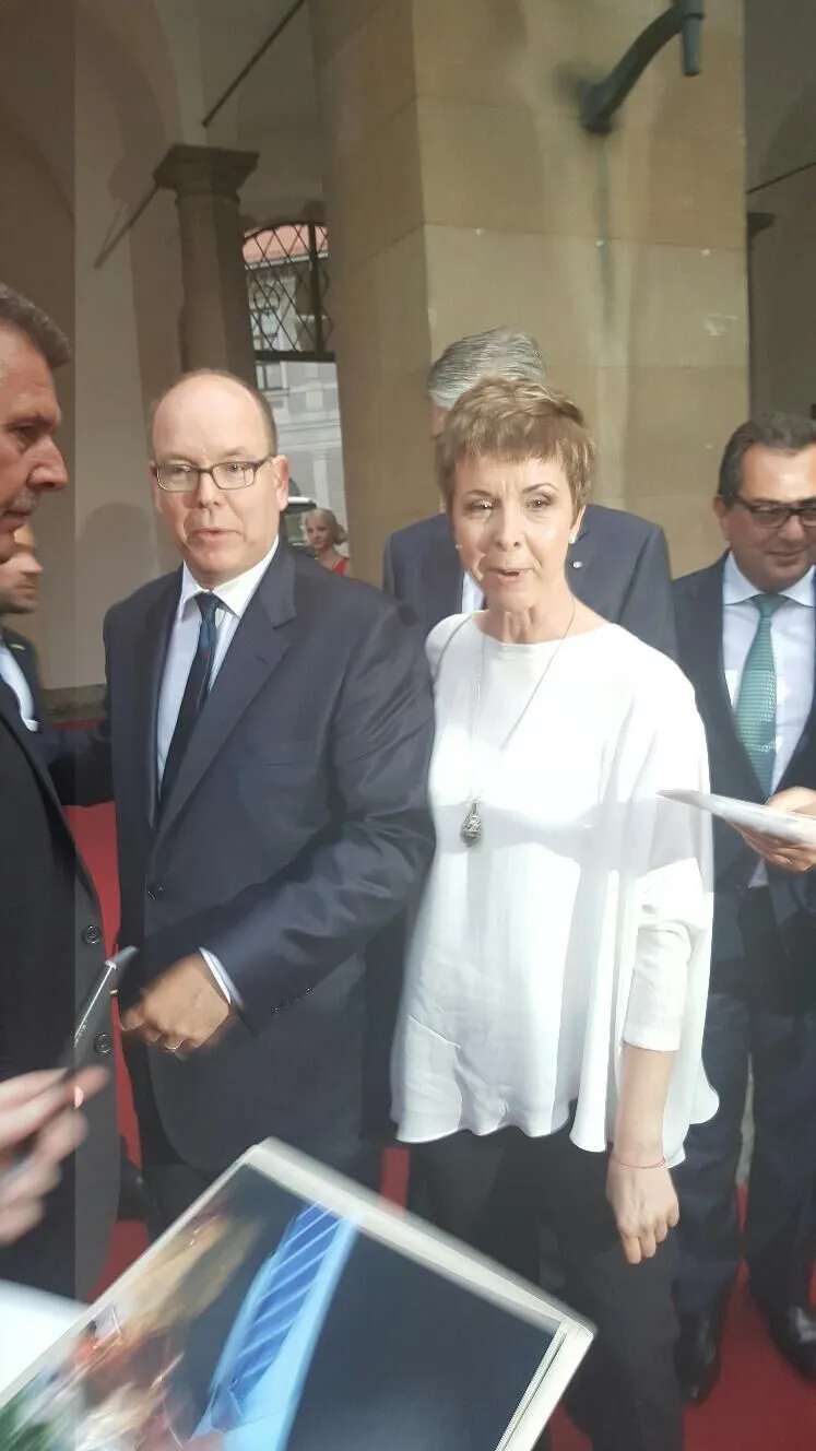Blitzbesuch von Fürst Albert von Monaco, hier mit seiner deutschen Beraterin Sabine Ferber , dahinter Gala-Co-Gastgeber Stavros Kostatinidis (r.)