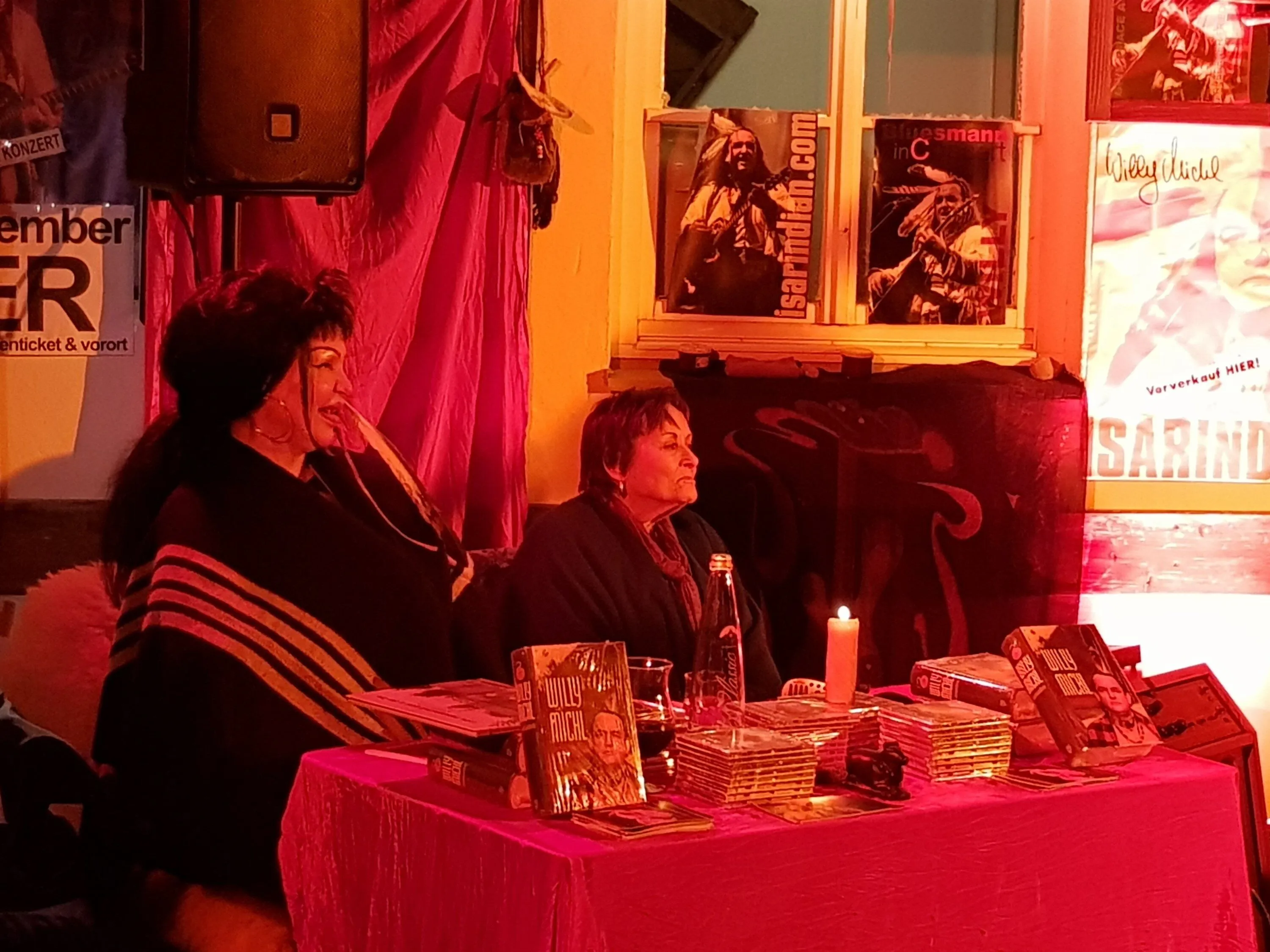 Mit seinen großen Händen bearbeitet der musikalische Einzelkämpfer die Gitarre mal sanft und mal hart, entlockt die verrücktesten Töne und die Saiten werden hämmernd und schnell so angegriffen, dass man sich nicht wundern würde, wenn sie reißen. Die Saiten reißen nicht, sondern erzeugen unter der mächtigen Handbehandlung himmlischen Blues. Zur Krönung obendrauf die unverwechselbare Männerstimme mit traumsicherer Tonlage und keinem Versprecher. Die Rothaut mit der Grünen-Vorliebe wirkt wie ein Fels und aus den Marlon-Brando-Lippen schlüpft Willy-Michl-Exklusivität. Das ganze Auditorium kann sich ihm nicht mehr entziehen. "Willy Michl." das würde Carlos Santana sagen , und Jimmy Hendrix oder Elvis Presley hätten es gesagt:" Er ist einer von uns, der Musikus aus München".