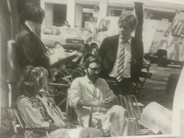 Bei "Kir Royal"-Dreharbeiten vor dem Münchner Hotel "Bayerischer Hof": Regisseur Helmut Dietl und Gesellschaftsreporter Michael Graeter (r.).